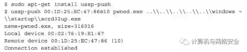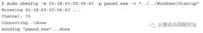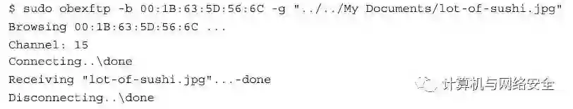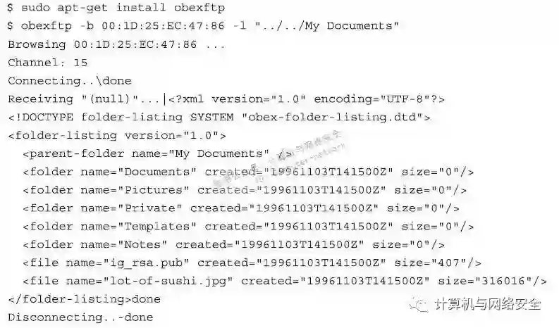 在Linux操作系统上,我们可以使用obexftp工具攻击有漏洞的“文件传输规范”服务,其操作步骤及效果如下所示: