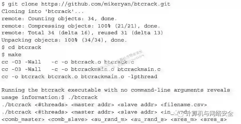 就像前面提到的BTCrack软件,必须先识别出“发起随机数”、两个“COMB_KEY值”、“认证随机数”、“签署响应”等值,以及“主设备”的“蓝牙设备地址”和“从设备”的“蓝牙设备地址”,才能进行随后的破解工作。其中命令行中的“#threads”参数所表示的是程序所用“线程”(thread)的数量,主要是告诉BTCrack OSS程序同时使用多个CPU内核来加速破解的进程;要想获得最好的破解效果,可以指定一个比系统中CPU数量大“1”的一个值作为“线程”的数量。