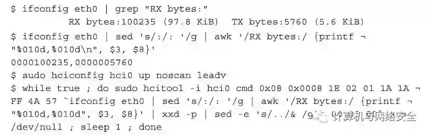 在这个例子中,从有线网络接口eth0上发送和接收的字节数,其实表示的是“低功耗蓝牙”信标数据包进行编码和发送的内容。样例中的这个数据包与iBeacon系统中的数据包是不兼容的,因为其中代表“制造商的ID”(详见“表2”)中,对于Apple电脑,该值为“004C”,但这里却随便写了一个任意值“4A 57”。但相比于两次单独使用“主ID”字段和“次ID”字段,这个数据包却可以发送更多的数据。