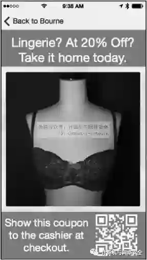 例如,考虑这样一种情况,通过逆向工程和网络通信数据包的捕获分析,攻击者识别到在Bourne商店的应用中,为到店顾客中逛到店内女性内衣摆放区的顾客提供一种优惠券。一旦有顾客满足这个条件,逛到了内衣区,那么她的行为就激发Bourne的应用程序,这时iBeacon发射器,就会发送“通用唯一标识符”为72C898A3-8F29-493B-8A34-41297FIB17B5,“次ID”为Ox4D49。那么攻击者就可以修改代码为如下代码段: