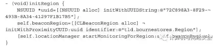 通过对整个商店内“通用唯一标识符”的使用,Bourne移动应用程序的开发者将程序的逻辑设定为:任何时候,当有一个顾客进入Bourne商店范围之内的时候,由于该商店使用的是“Apple核心定位框架”(Apple Core Location Framework),所以这个顾客的手机就会注册一个iOS应用,通过该应用就会收到一个提醒消息(alert)。这个“Apple核心定位框架”是用Objective-C编程语言开发的,其部分核心代码如下:
