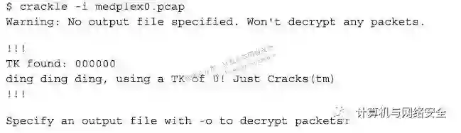 在这个例子中,“临时密钥”TK的值被成功地还原出来,为“000000”,这是一个在“只比较不确认”认证方式中也使用的一个公共值。可以有选择地使用Crackle程序解密捕获到的数据包,也可以指定一个文件名,将其捕获的数据包输出到一个文件中。