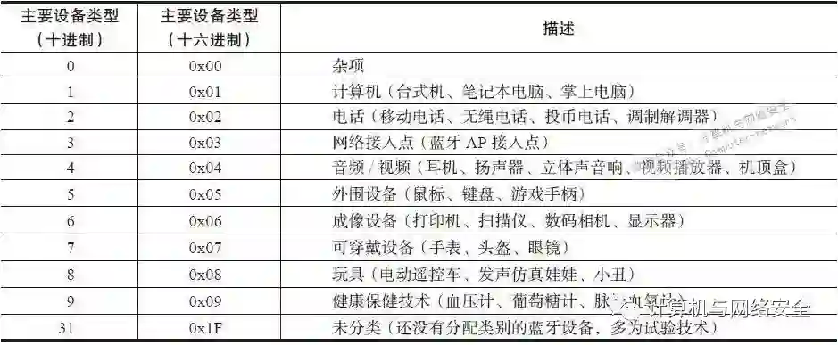 “次要设备类型”字段表示是给定的“主要设备类型”设备之下,再进行的二级细分。比如说,当主要类是“电话类型”(“主要设备类型”的值为0x02)时,根据“次要设备类型”字段就可以区分到底是移动电话(“次要设备类型”的值为0x01)、无绳电话(“次要设备类型”的值为0x02)、智能电话(“次要设备类型”的值为0x03)或者是有线调制解调器(“次要设备类型”的值为0x04)。