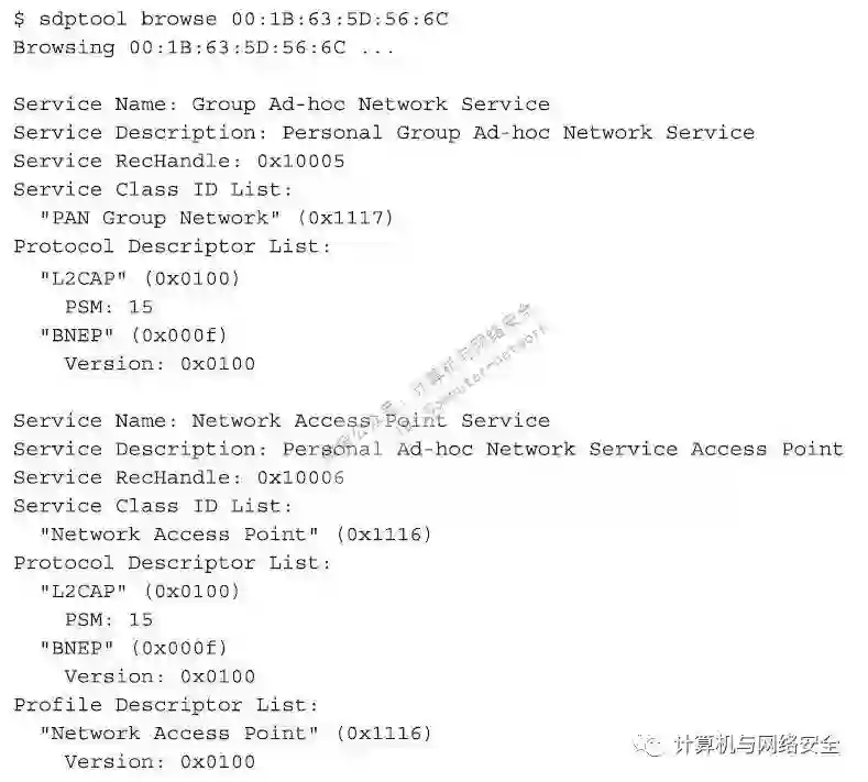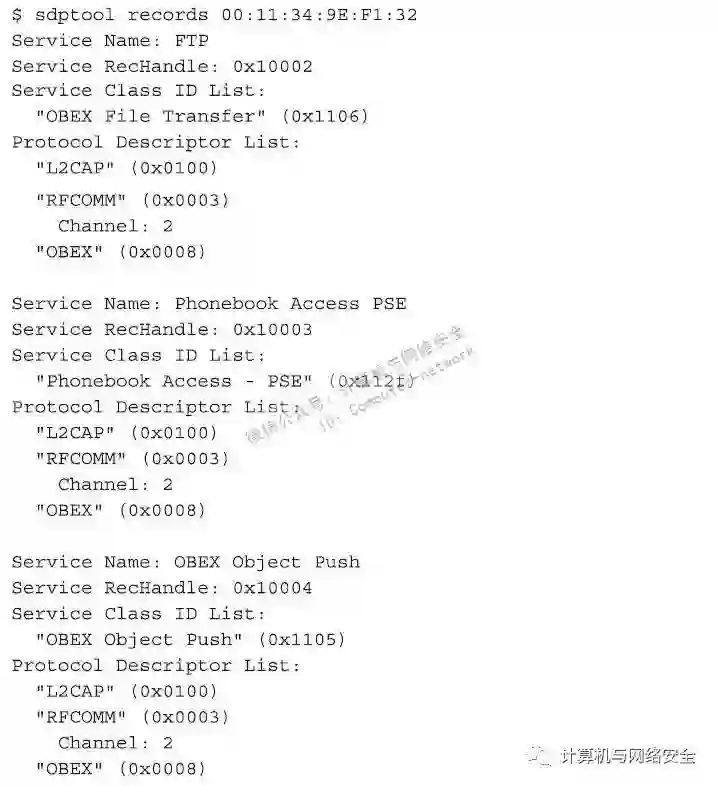 许多有关蓝牙设备在软硬件实现中的漏洞识别和报告,其成因实际上都是蓝牙规范本身在设计实现上存在的漏洞。有各种各样蓝牙“服务发现”类的工具,可以读取蓝牙设备上的所有服务,以及指定服务以后,可以读取该服务的详细信息。BlueZ开发包中的sdptool程序可以浏览目标蓝牙设备上的服务,也可以在明确地指明某个服务后,向目标蓝牙设备发出请求服务信息,然后借助于读取到的目标蓝牙设备服务信息,我们可以发现,这些服务都是各自为政,独立地使用系统的安全控制参数,而这些服务中,经常会有某个服务会为攻击者提供未授权的访问权限。
