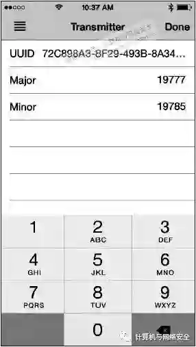 即使不使用Linux操作系统的主机,攻击者可以在iOS操作系统内核上,使用具有低功耗iOS设备能够冒充任意的“通用唯一标识符”,“主ID”和“次ID”,将这三个值组合使用后,就可以冒充免费的xBeacon应用程序。xBeacon应用程序的一个应用实例如图7所示。需要说明的是,在图7中,xBeacon应用程序的“主ID”和“次ID”显示的是十进制的格式,而不是上面我们常用的十六进制格式。