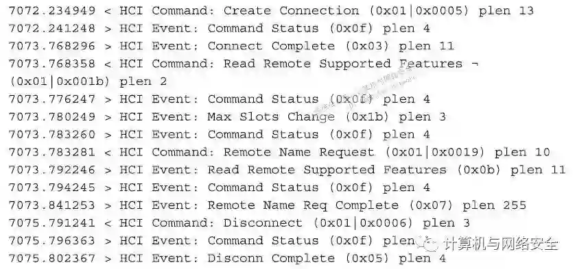 在hcidump命令的结果中,“小于号”和“大于号”表示的是“主机控制接口协议”层数据通信数据包的流向。从“高堆栈层”(upper-stack layer)流向低堆栈层(lower-stack layer)的时候,就用“小于号”(即实例中的“<”);从“低堆栈层”流向高堆栈层的时候,就用“大于号”(即实例中的“>”)。另外,这些符号除了表明数据在本地设备上协议栈之间的流向之外,也同时表明了数据在本地蓝牙设备和远端蓝牙设备之间的流向,通常情况下,“小于号”表示数据通信数据包从本地蓝牙设备流向远端蓝牙设备,“大于号”表示从远端蓝牙设备返回到本地蓝牙设备。不过,在某些情况下也有例外,比如“命令”状态(即实例中部分“Commmand”)中,数据是直接由“主机控制接口协议”层本身而来,而不是从远程蓝牙设备发送而来的。