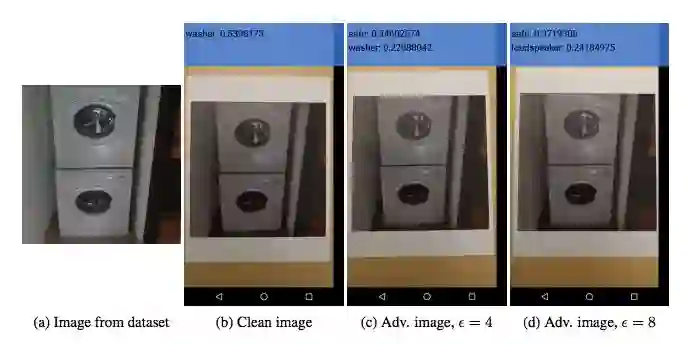 对抗样本可以在标准纸张上打印出来并用标准分辨率的智能手机拍照,并且在这种情况下仍然会导致分类器将“洗衣机”标记为“安全”