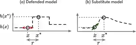 执行梯度掩码的防御策略通常会导致一个模型在特定的方向和训练点的附近非常平滑,这使得攻击者很难找到指示好候选方向的梯度,从而以损害模型的方式干扰输入。然而,攻击者可以训练一种替代模型:一种通过观察被防御模型分配给攻击者精心选择的输入的标签来模仿防御模型的副本。