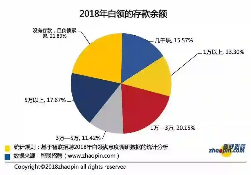 另据智联招聘《2018白领满意度指数调研报告》显示:2018年度存款超过3万元的白领仅占3成;21.89%的白领不仅没有存下钱,还欠了债务;存款余额为“1万-3万”的白领也只占20.15%。