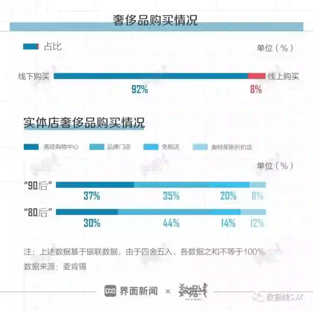 现如今网购虽然盛行,但奢侈品线上购买的潜力尚未被激发。据麦肯锡报告,超9成的消费者选择线下购买奢侈品。其中,高级购物中心和品牌门店是“80后”和“90后”的最爱。