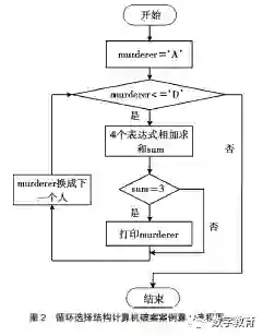 本案例的算法设计如图2 所示。算法是先假设凶手是A,然后判断这四个人说的话是否有三句是真实的(显然,若A 为凶手,A、B、C 都说了假话,排除); 再假设凶手是B,再一次判断这四名嫌疑人的话是否有三句是真实的,以此类推,直到假设凶手是D 时结束。其中谁的假设条件满足有三句话是真实的,那该人就是凶手,最后推出凶手是C(此时A、B、D 都说的是真话,C 说了假话)。