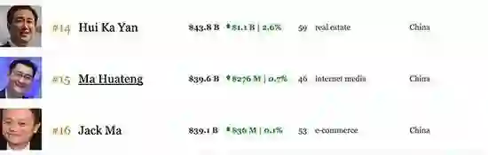 截至10月6日午间收盘,在香港上市的房地产开发商中国恒大报31.5港元/股,涨幅2.44%,总市值达到4137亿港元;融创中国报41.9港元/股,涨幅4.75%,总市值为1732亿港元。根据福布斯实时富豪排行榜显示,目前恒大集团董事局主席许家印以身价438亿美元坐稳中国首富位置,在全球富豪榜中排名第14位,紧跟其后的是腾讯公司董事会主席兼首席执行官,身价396亿美元,排名第15,阿里巴巴董事局主席马云以身价391亿美元排名第16位。