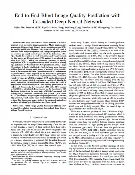 引用格式:J. Wu, J. Ma, F. Liang, W. Dong, G. Shi and W. Lin, "End-to-End Blind Image Quality Prediction with Cascaded Deep Neural Network," in IEEE Transactions on Image Processing, doi: 10.1109/TIP.2020.3002478.