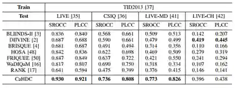 在5个公开的标准IQA数据库上验证了论文算法的性能。实验结果表明论文算法达到了与人类主观感知的高度一致性。尤其在跨库实验当中,该算法在大多数情况下取得了明显的优势。另外,使用论文建立的数据库重新预训练了其他算法,数据库可以有效的提升其他算法的泛化性能。实验结果见表2-4。