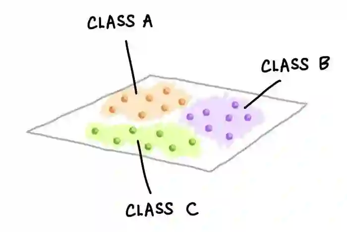 三类数据样本在二维中的显示。上图显示的是数据样本的假设分布。这种可视化图可以通过执行PCA分析并显示前两个主成分(PC)来创建;或者也可以选择两个变量的简单散点图可视化。