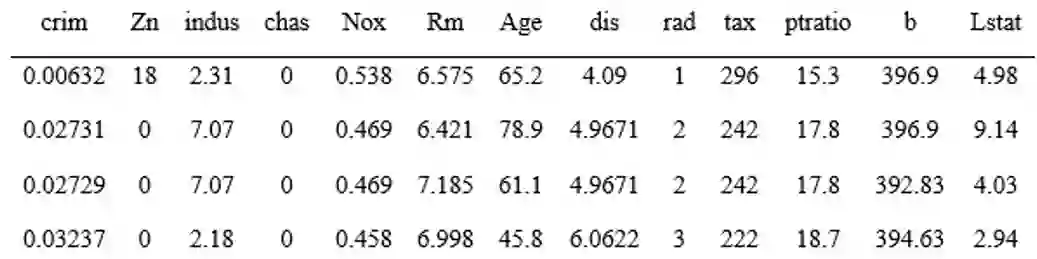 波士顿住房数据集(Boston Housing Dataset)是数据科学教程中通常使用的一个热门示例数据集。该数据集由506行和14列组成。为了简洁起见,下面显示的是标题(显示变量名称)加上数据集的前4行。