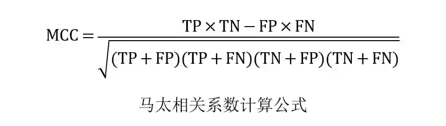 其中TP、TN、FP和FN分别表示真阳性、真阴性、假阳性和假阴性的实例。应该注意的是,MCC的范围从-1到1,其中MCC为-1表示最坏的可能预测,而值为1表示最好的可能预测方案。此外,MCC为0表示随机预测。