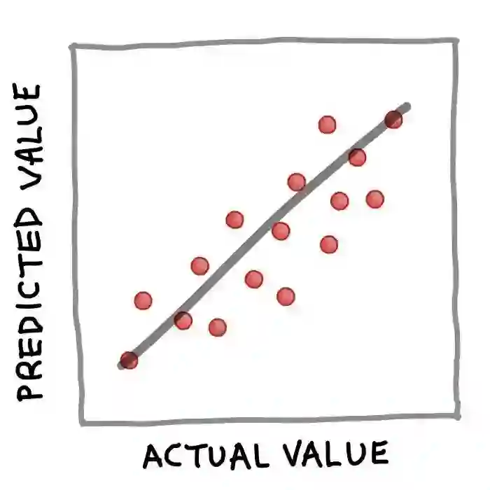 简而言之,可以通过以下简单等式很好地总结训练有素的回归模型:Y = f(X)。其中,Y对应量化输出变量,X指输入变量,f指计算输出值作为输入特征的映射函数(从训练模型中得到)。上面的回归例子公式的实质是,如果X已知,就可以推导出Y。一旦Y被计算出来(我们也可以说是 "预测"),一个流行的可视化方式是将实际值与预测值做一个简单的散点图,如下图所示。