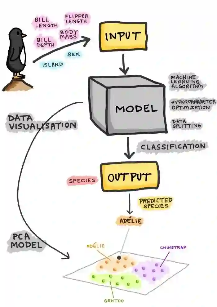 一旦模型被训练,得到的模型就可以用来对类别标签(即在我们的案例中企鹅种类)进行预测,可以是三种企鹅种类中的一种:Adelie、Chinstrap或Gentoo。