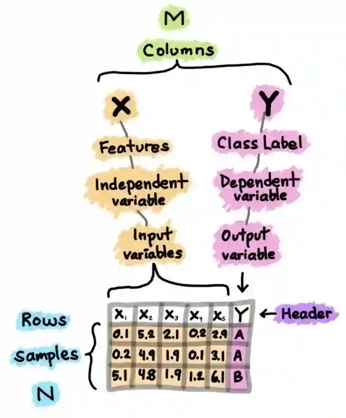 列可以分解为X和Y,首先,X是几个类似术语的同义词,如特征、独立变量和输入变量。其次,Y也是几个术语的同义词,即类别标签、因变量和输出变量。