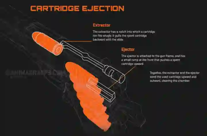 通过击发,引燃发射药产生巨大压力,将弹丸推出。子弹上膛后,扣动扳机,枪内的撞针撞击子弹后面,引发子弹火药,子弹射出的一瞬间,产生的后坐力,就像火箭一样,枪管壁都有螺旋纹理,子弹射出时其实是高速旋转的,这样能确保子弹不偏离航向,更准确的打击目标。