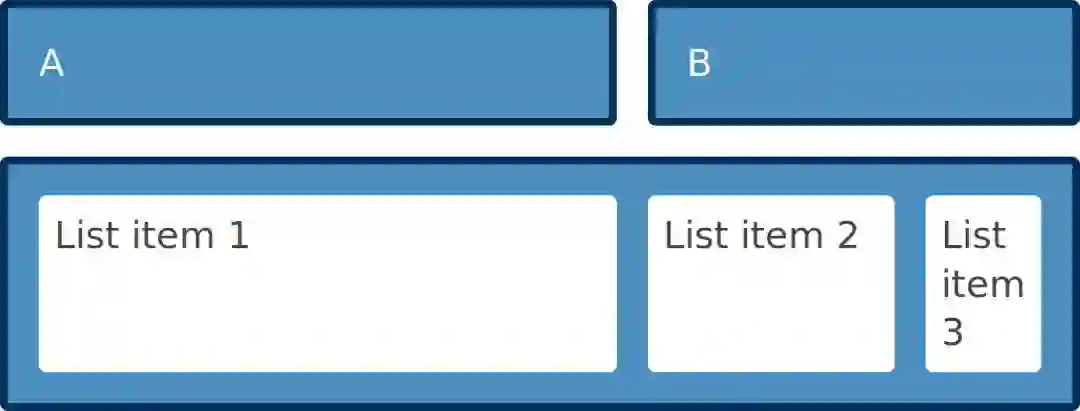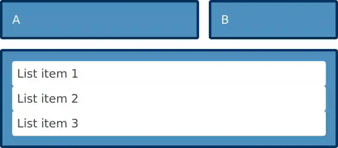 下面的示例中有一个元素用作一个网格容器。它包含三个子元素:两个<div>和一个<ul>。