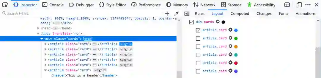 你现在可以使用 DevTools 高亮显示多个网格。这样更容易看清楚网格之间的排列关系。例如,你可以在上面的卡片示例中高亮显示多个网格,看看卡片示例中的行是如何与父行对齐的。