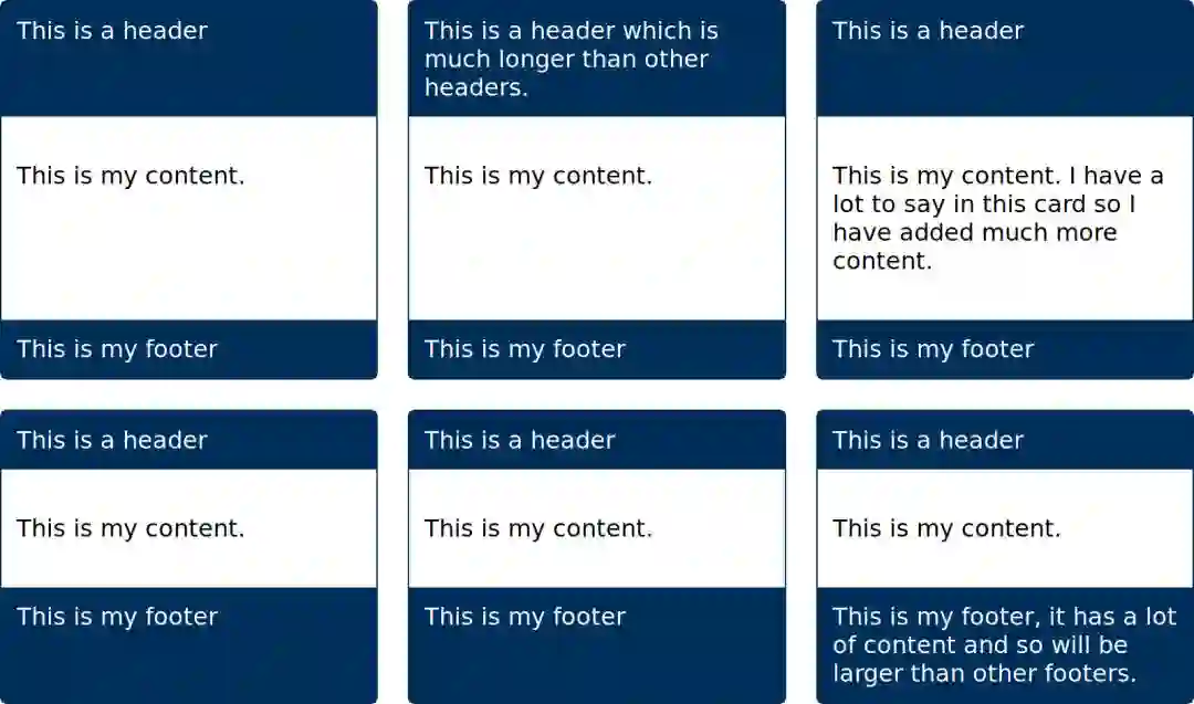 例如,如果你做了一个卡片布局,并且卡片的页眉和页脚内容不均匀,你可能会希望卡片页眉和页脚在行间对齐。但使用标准的嵌套网格是做不到这一点的。因为每张卡片上的网格各自独立,所以卡片 A 中的轨道大小不能响应卡片 B 内的高度变化。