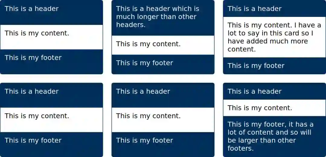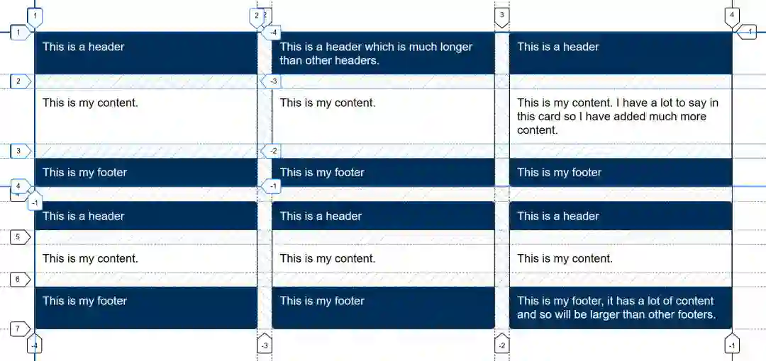 这张卡片还是跨越三行轨道,但这些行是在父级上定义的,因此它们的页脚都位于同一行。如果某一个页脚变得更高,整行都会随之升高。