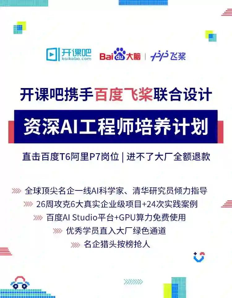 即使百度作为国内AI行业的领军者,但在AI项目中依然缺乏有实践经验具备可实际解决问题能力的AI工程师,为解决这一难题,百度飞桨与国内在线IT教育独角兽开课吧首次深度合作,联合设计本门课程,旨在培养具有核心竞争力的AI工程师。