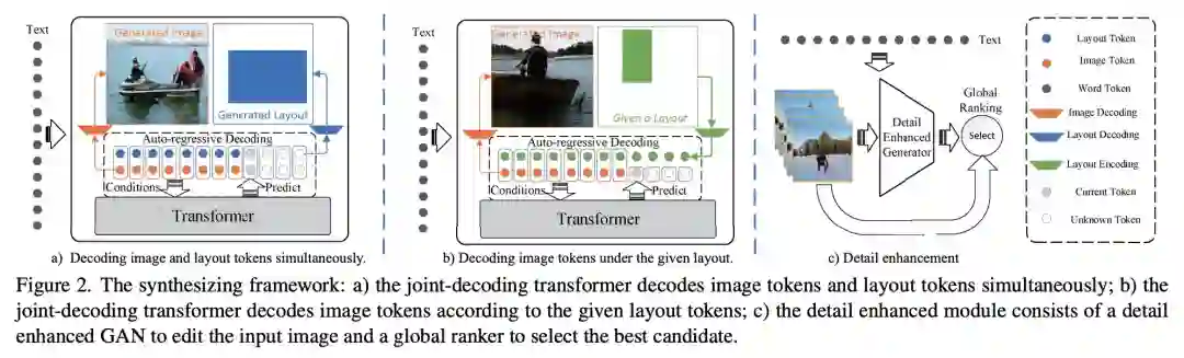 面向对象的文本到图像合成常常以两步方式生成自然语言描述的图像:首先使用文本生成场景布局信息,然后基于该布局和文本合成相应的图像。在该任务中,生成符合语言描述的结果都不是简单任务,并常会遇到处理过于复杂和错误传播等问题。此外,目前如CogView和DALL-E等先进方法没有考虑到场景布局相关信息,往往难以有效地细致控制场景的合成以生成符合用户偏好需求的图像。因此,基于Transformer结构,我们提出了一种对象引导的联合解码方法,能够同时生成符合语言描述的图像和相应的场景布局。为了在Transformer中引入场景布局信息,我们构造了Layout-VQGAN来压缩类别形式的场景布局信息,以生成布局tokens并与图像tokens联合描述场景。此外,考虑到在VQ-GAN的压缩过程中可能会丢失图像细致细节特征及联合Transformer生成能力受资源限制等问题,我们构建了一种基于仿射组合模块的文本细节增强模型,以改善文本相关的图像生成细节。实验结果表明,我们的方法能够使用文本生成高质量图像,并且能够根据给定的场景布局信息生成相应的多样化图像。