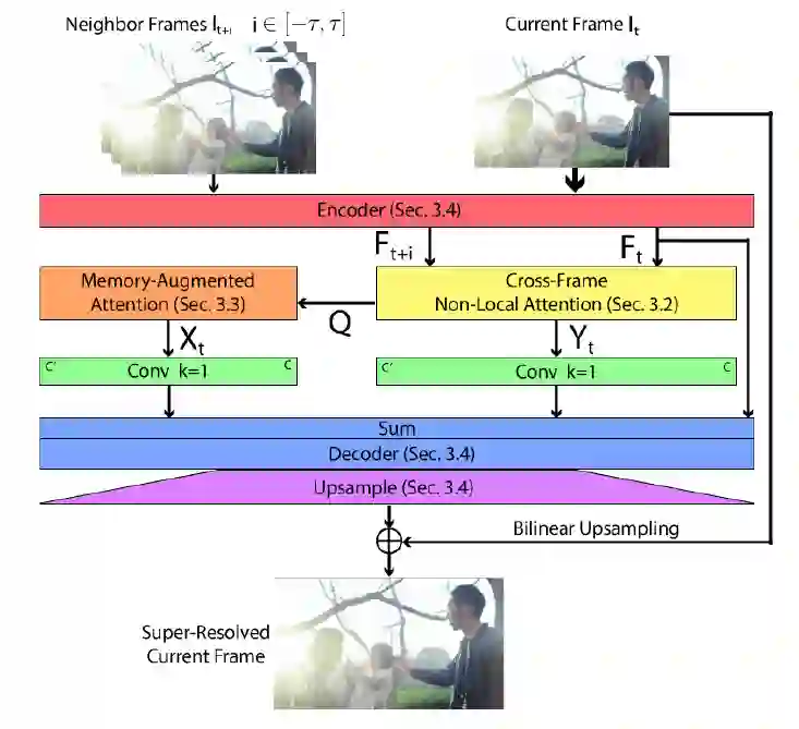 本文提出了一种简单有效的从低分辨率视频恢复高保真和高分辨率视频的方法。已有方法主要利用时域相邻帧来辅助关键帧的超分辨率,但由于在空间对齐相邻视频帧难度较大,并且同为低分辨率的相邻视频帧可以提供的有用高频信息有限,现有视频超分辨率性能受到了限制。针对这个问题,我们提出了一种跨帧注意力机制,可以在不进行显式空间对齐相邻帧的情况下进行视频超分辨率,在包含较大运动的视频中展现出了出色的鲁棒性。另外,为了获取输入低分辨率视频的之外的图像细节信息,并对运动视频中信息损失进行补偿,我们提出了一种全新的记忆增强机制,以在网络训练阶段记忆通用的视频图像信息,辅助测试过程中的视频超分辨率。经过在多个有挑战性的视频数据集进行大量的评估,与当前最先进的视频超分辨率方法相比,我们的方法不仅具有显著的性能提升,并且对不同类型的实际视频中有很好的通用性。