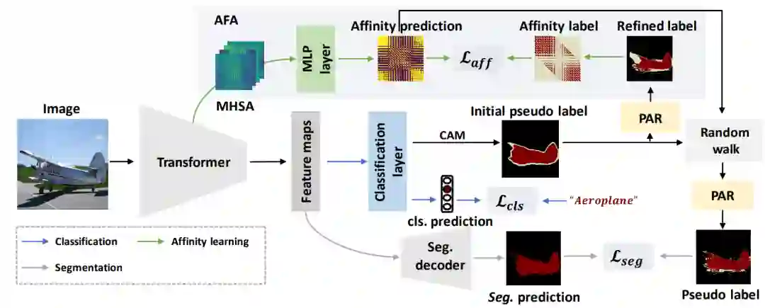 基于图像级标注的端到端弱监督语义分割是一项非常具有挑战性的任务。目前的方法主要基于卷积神经网络,无法准确建模全局信息,因此会导致初始伪标签的对象区域不完整。在本文中,为了解决该问题,我们引入了Transformer结构,它自然地整合了全局信息,从而能生成更完整的初始伪标签。进一步的,受Transformer中的自注意力和语义关联之间的内在一致性的启发,我们提出了一个Affinity from Attention (AFA)模块来从Transformer中的多头自注意力矩阵中学习像素的语义关联。然后利用学习到的语义关联来细化初始伪标签。此外,为了有效地导出用于监督AFA模块的可靠标签,并确保伪标签的局部一致性,我们设计了一个像素自适应细化模块。该模块基于low-level图像外观信息来细化伪标签。我们在VOC和COCO数据集上进行了实验,取得了显著优于最近方法的效果。