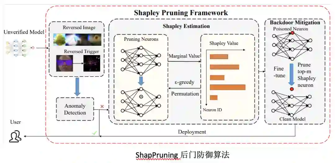 神经网络在诸多领域有着广泛的应用,但已有研究表明神经网络容易遭受后门攻击,造成潜在安全威胁,因此后门防御是一个非常重要的问题。已有后门防御工作通常需要较多训练数据并剪除大量神经元,这些防御算法容易破坏网络原本结构并依赖于来网络微调操作。为了更高效准确地去除神经网络中的后门攻击,我们提出一种基于Shapley value的ShapPruning后门去除算法。ShapPruning利用触发器逆合成估计后门触发器,并通过蒙特卡洛采样以及epsilon-greedy算法高效估计神经网络中各神经元与网络后门攻击行为的关联程度,从而准确定位后门感染神经元,进而更精准的指导后门去除。相较于之前研究,我们的工作可以在每一类只有一张图片的情况下去除后门攻击,同时印证了后门攻击只通过感染神经网络中极少数神经元(1%左右)实现网络操纵。同时,我们采用data-inverse的方法,从感染模型中恢复训练数据,提出了一种无数据的混合模式ShapPruning算法,实现了无数据的神经后门去除。我们的方法在数据缺乏情况下,在CIIFAR10, GTSRB, YouTubeFace等数据集上针对已有后门攻击方式均取得了很好的效果。