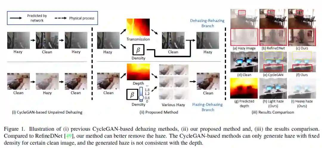 为了克服在合成数据集上训练的去雾模型的过拟合问题,许多最近的方法试图使用非成对数据进行训练来提高模型的泛化能力。然而其中大多数方法仅仅简单地遵循CycleGAN的思路构建去雾循环和上雾循环,却忽略了现实世界中雾霾环境的物理特性,即雾霾对物体可见度的影响随深度和雾气密度而变化。在本文中,我们提出了一种自增强的图像去雾框架,称为D4(Dehazing via Decomposing transmission map into Density and Depth),用于图像去雾和雾气生成。我们所提出的框架并非简单地估计透射图或清晰图像,而是聚焦于探索有雾图像和清晰图像中的散射系数和深度信息。通过估计的场景深度,我们的方法能够重新渲染具有不同厚度雾气的有雾图像,并用于训练去雾网络的数据增强。值得注意的是,整个训练过程仅依靠非成对的有雾图像和清晰图像,成功地从单个模糊图像中恢复了散射系数、深度图和清晰内容。综合实验表明,我们的方法在参数量和FLOP更少的情况下去雾效果优于最先进的非成对去雾方法。