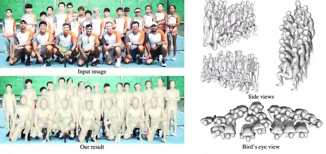 对于任意一张包含多个人的图像,我们的任务是直接从中预测所有人的3D姿势、形状、以及他们的相对深度。然而,当缺少人体高度的先验信息时,从单张图像预测人与人的相对深度通常是模糊不准确的,尤其是场景中包含从婴儿到成人不同身高并且紧密排列的多个人。为了解决这个问题,首先,我们提出了一种基于鸟瞰图(BEV,Bird's-Eye-View representation)的3D表征方式,与以往基于图像平面的2D表征不同,BEV 同时推理图像平面和深度方向的人体中心位置,由此形成相机空间中的人体3D位置。不同于现有的多阶段算法,BEV使用端到端可微分的单阶段网络。其次,由于人的身高随年龄变化,如果年龄未知,则无法准确解决图像中人的相对深度估计问题。为此,我们设计了全年龄段的3D人体模型空间,BEV 能够预测出从婴儿到成人的全年龄段人体形状。最后,为了有效训练模型,我们构建了"Relative Human" (RH)数据集,标注了年龄、姿态、人与人的相对深度关系等丰富信息。在RH 和 AGORA 数据集上的大量实验结果表明,我们的算法BEV 在深度预测、儿童3D形状预测,以及遮挡等复杂场景下,都具有优越的性能。