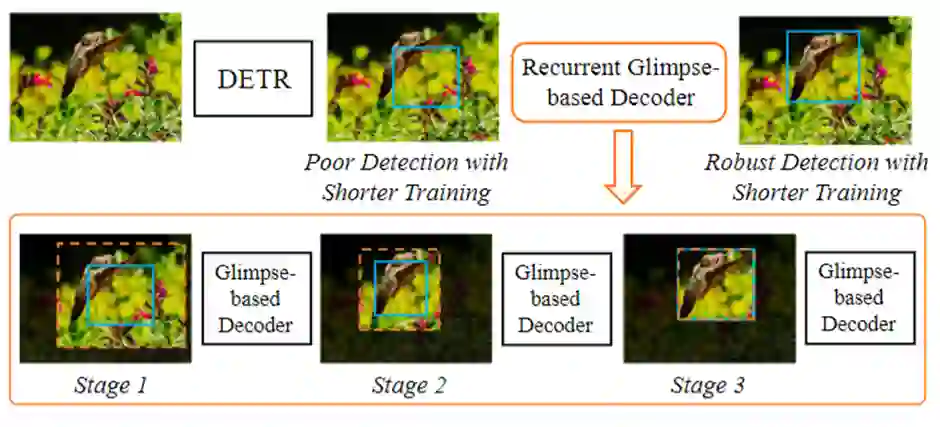 近期,基于Transformer的目标检测算法得到了大量关注。这一类算法通过建模全局视觉信息,能直接输出图片中出现物体的详细位置和类别信息。和传统目标检测算法不同,此类算法避免了额外的后处理过程,能高效高质量地进行目标检测。然而,此类算法往往需要极长的训练周期来优化模型参数并确保其能正确地关注物体区域。这一缺点极大地阻碍了相关领域的发展。尽管一些近期的工作指出优化特征表示或是改进模型结构能一定程度上缓解这一问题,我们发现有关可能包含物体的兴趣区域(region-of-interest)信息能直接、简单、有效地帮助缩短需要的训练周期。依此,在本文中,我们提出了一个利用递归“瞥视”解码器的方法来利用兴趣区域信息,从而有效加速基于Transformer的目标检测算法。具体来说,我们试图模仿人类的视觉感知过程并借助类似于“瞥视”的行为获取有关物体位置的大致信息,然后通过一个多阶段递归的处理过程,帮助模型逐渐地聚焦到正确的物体区域,从而较大程度上降低模型进行目标检测的难度,减少其所需的训练周期。在每一个阶段中,我们通过扩大物体兴趣区域并提取其中的视觉信息作为“瞥视”的实现,然后我们引入了一个视觉解码器以解释获取到的“瞥视”信息。我们基于视觉解码器的输出来产生本阶段的目标检测结果,这一结果之后被递归地送到下一阶段的处理过程中,进而产生改善的目标检测结果。在大数据集实验中,我们的方法可以被证明能减少30%左右当前最先进模型所需的训练周期且不使得目标检测准确率下降。在使用相同训练周期的情况下,我们的方法也能进一步提升5%左右的检测准确率。这些结果证明了我们提出的方法在基于Transformer的目标检测算法上的高效性,同时也展示出了我们的方法代表了本领域发展的最前沿成果。