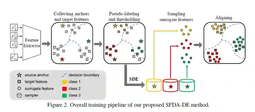 域适应旨在将从带标签的源域学到的知识迁移到数据分布不同的无标注的目标域。然而,由于隐私保护政策,大多数现有方法所需的源域中的训练数据通常在实际应用中不可用。最近,无源域适应(SFDA)引起了广泛关注,它试图在不使用源数据的情况下解决域适应问题。在这项工作中,我们提出了一个名为 SFDA-DE 的新框架,通过源分布估计来解决 SFDA 任务。首先,我们使用球形k-means聚类为目标数据生成鲁棒的伪标签,其初始类中心是预训练模型分类器学习的权重向量(锚点)。此外,我们建议通过利用目标数据和相应的锚点来估计源域的类条件特征分布。最后,我们从估计的分布中采样替代特征,并通过最小化对比适应损失函数来对齐两个域。大量实验表明,本文提出的方法优于需要大量源数据的传统域适应方法,在多个域适应基准上达到了最先进的性能。