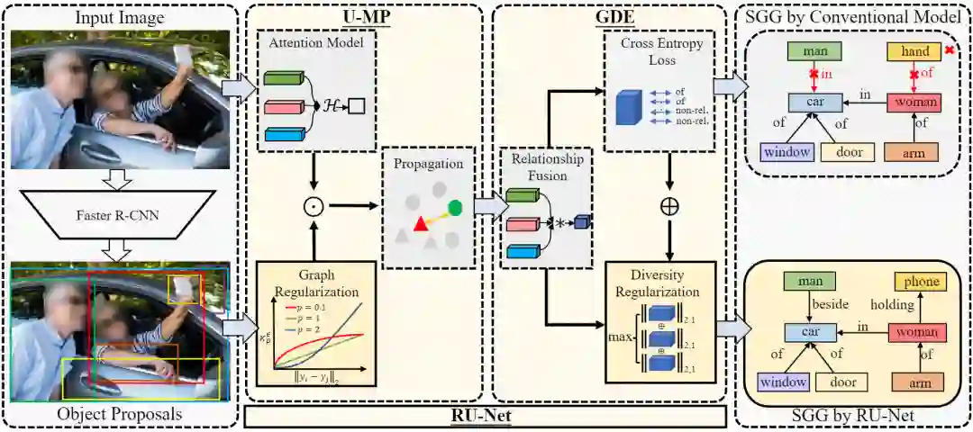 场景图生成(SGG)旨在检测图像中的物体并预测每对物体之间的关系。现有的 SGG 方法通常存在两个问题:1) 由于图神经网络的消息传递 (GMP) 模块对虚假(错误)的节点间联系比较敏感,导致物体表征变得模棱两可;2) 由于类别不均和标签缺失,导致关系预测的多样性降低。为了解决这两个问题,我们在文章中提出了一个正则化展开网络(RU-Net)。首先,我们从unrolling算法的角度出发,研究了 GMP 与图拉普拉斯去噪 (GLD) 之间的关系,推导出GMP可以表述为 GLD 的求解器。基于这一证明,我们提出了一个基于unrolling的消息传递模块,并引入了一个基于p-范数的图正则化项来抑制节点之间的虚假连接。其次,我们提出了一个group(组)多样性增强模块,通过秩最大化来提升关系预测的多样性。大量实验表明,RU-Net 在各种设置和指标下都是有效的。除此之外,RU-Net 在三个流行的数据库:VG、VRD 和 OI 上达到了最高的性能。同时,代码将在 GitHub 上发布。