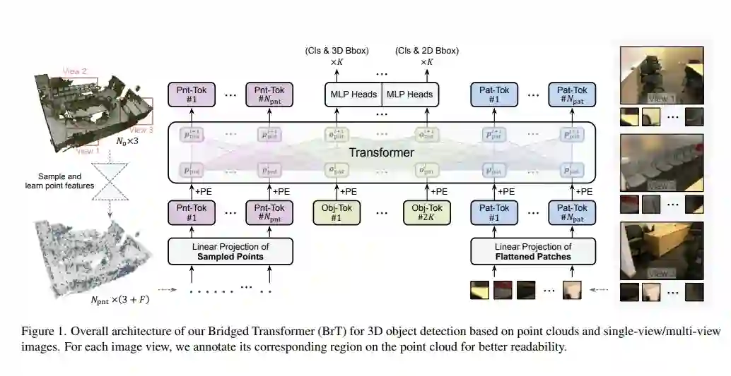 三维检测是计算机视觉领域的重要研究课题,在传统的研究设置中常常基于三维点云进行学习。最近,在三维检测的研究中有一种利用多种来源输入数据的趋势,例如使用色彩图像来对点云进行补充。然而,由于二维和三维表示具有异构的几何结构,使得现成的神经网络模型难以被直接用于实现图像-点云融合。为此,我们提出了桥接Transformer(BrT),一种用于三维检测的端到端架构。BrT是一种简单有效的方法,它可以同时从点云和图像中学习识别三维和二维物体的检测框。BrT的一个关键要素在于使用目标索引来桥接三维和二维特征,这将不同数据源的数据表示统一在一个Transformer中。我们采用了一种通过点到图像的投影实现特征聚合,进一步加强了模态之间的相关性。实验表明,在SUN RGB-D和ScanNetV2数据集上,BrT超过了已有的先进方法。