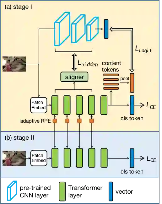 Transformer在视觉领域取得了巨大进展,然而却需要巨大的数据量,因此我们针对视觉Transformer提出了一种早期知识蒸馏框架——DearKD,来提升其在不同数据量下的性能,降低对数据量的敏感度。DearKD包含两个阶段,在第一阶段我们通过蒸馏卷积网络隐藏层与输出层的知识使得Transformer学到卷积网络的归纳偏置降低网络的数据依赖性,在第二阶段我们让网络学习自身固有的归纳偏置以提升网络的最终性能。此外,DearKD还可以被应用在极端的无数据场景下,在这个场景下,我们提出了边界保持的多样性损失函数以提升生成样本的多样性的同时保证样本是真实性,使得样本更贴近真实数据。我们在ImageNet全部与部分数据、无数据以及下游任务上均取得了SOTA的性能。