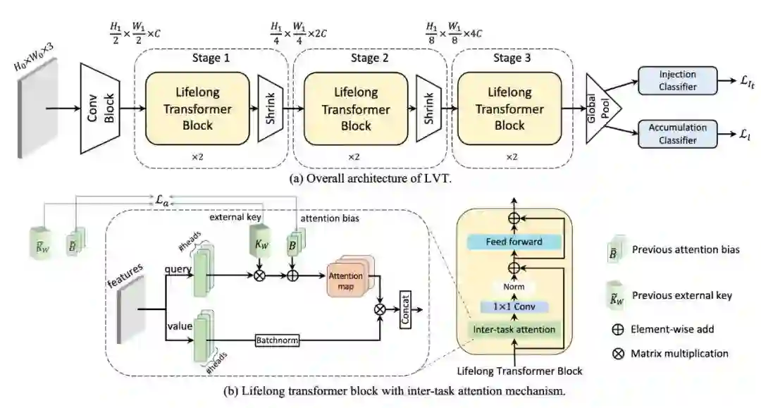 连续学习算法从不断到来的数据流中训练神经网络,以减轻灾难性遗忘。然而,现有的方法都是基于卷积神经网络 (CNN) 并为其设计的,这些方法并没有充分利用新出现的Vision Transformer的潜力。在本文中,我们提出了一种新颖的基于注意力的框架 Lifelong Vision Transformer (LVT),以在连续学习中实现更好的稳定性-可塑性权衡。具体来说,LVT中提出了一种任务间注意力机制,它隐式地吸收了先前任务的信息,减缓了重要的注意力在先前任务和当前任务之间的漂移。LVT 设计了双分类器结构,独立注入新的表征以避免对先前知识的干扰,并均衡地积累新旧知识以提升整体性能。此外,我们还开发了一种基于置信度的缓存更新策略,以加深对先前任务的印象。广泛的实验结果表明,我们的方法在连续学习的基准数据集上以更少的参数实现了最先进的性能。