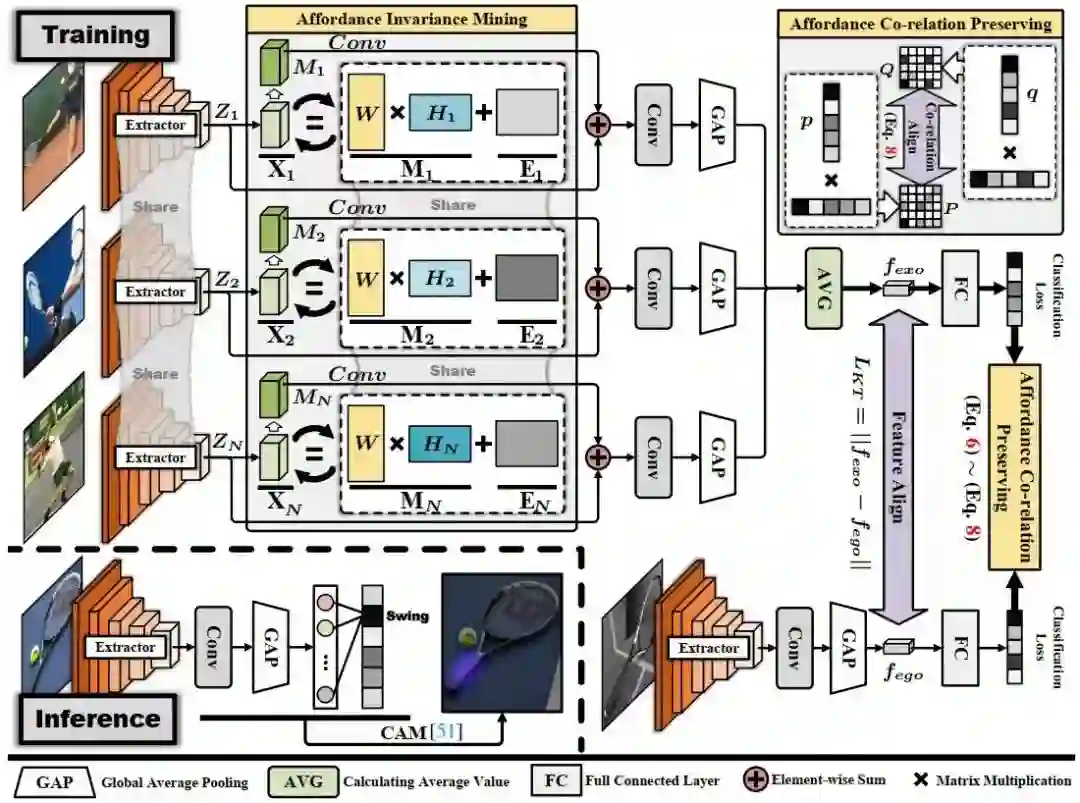 可供性标定(affordance grounding)是定位物体上动作可能性区域的一种任务,由于存在多样的交互从而导致难以与物体局部区域建立显式的联系。但是,人具有从多样的第三人称交互迁移到第一人称下不变的可供性特征来抵御多样的交互带来的影响的能力。为了使得智能体具有这样的能力,本文提出了一个从第三人称视角学习可供性标定的任务,即给定一张第三人称视角的人-物体交互图像和一张第一人称视角的物体图像,仅利用可供性标签作为监督,从第三人称视角的图像中学习可供性知识,并迁移到第一人称视角中。为此,我们提出了一个跨视角知识迁移框架,从第三人称视角的交互中提取可供性相关的知识,并通过维持可供性的共生关系增强网络对可供性区域的感知能力。具体地,一个可供性不变特征挖掘模块通过最大限度地减少第三人称视角图像中由交互习惯所产生的类内差异来提取特定的线索。此外,还提出了一种可供性共生关系保留策略通过对齐两个视角预测结果之间的共生关系矩阵来感知和定位可供性区域。特别地,通过收集和标记了超过2万张来自36个可供性类别的图像来构建了一个名为AGD20K的数据集。实验结果表明,我们的方法在客观指标和视觉质量上均优于其他代表性方法。