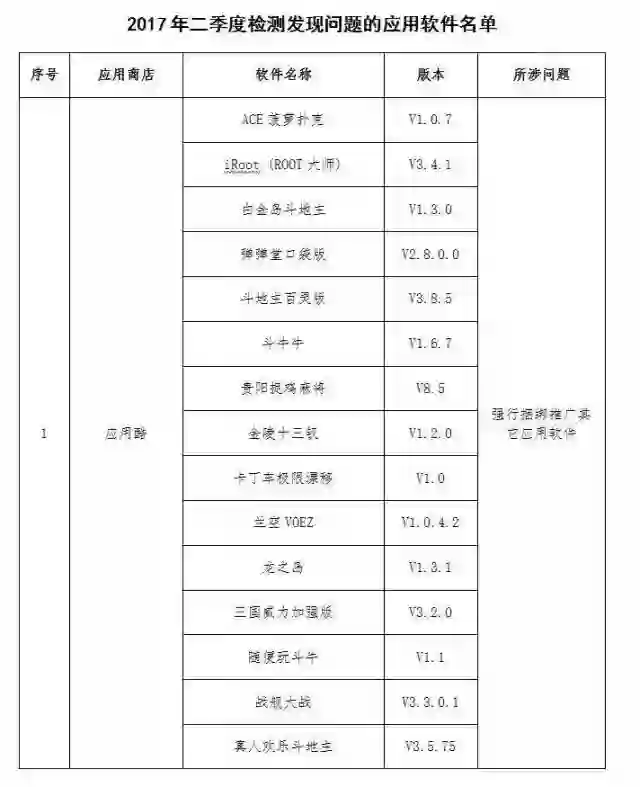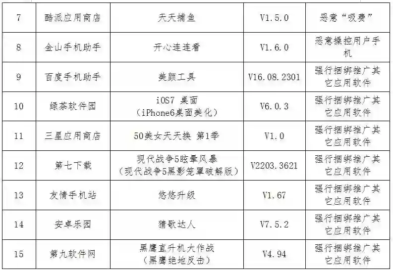 通告显示,二季度,工信部组织对55家手机应用商店的应用软件进行技术检测,发现违规软件42款,涉及违规收集使用用户个人信息、恶意“吸费”、强行捆绑推广其他应用软件等问题。