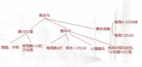 举个例子,我决定今年去跑一次全程马拉松的话,那我就可以把它拆解为跑到十公里;十公里还可以继续往下拆解,五公里、三公里、一公里……