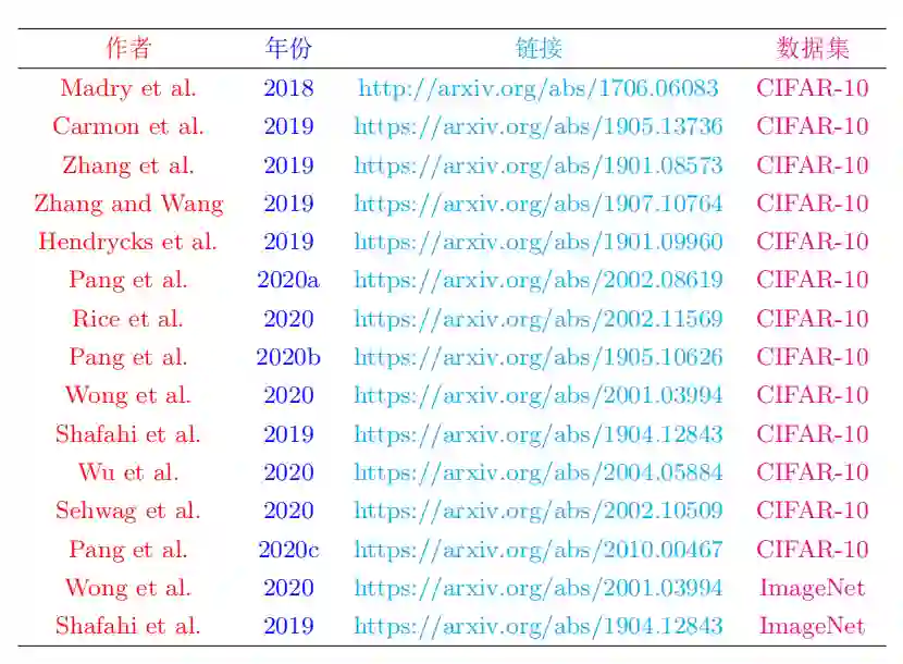 比赛方通过15个防御模型测试选手提交的攻击算法,其中包括13个在CIFAR-10上训练的模型和2个在ImageNet上训练的模型,比赛方将会利用CIFAR-10测试集的前1000个数据和ImageNet ILSVRC 2012验证集中随机挑选的1000个数据进行测试。为了方便查阅我将其整理成如下表格: