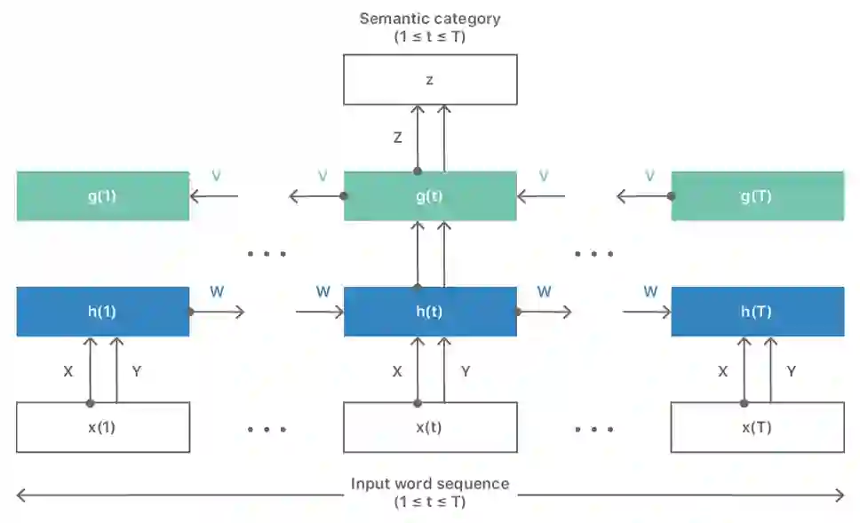 网络的输出是与输入文本相关联的语义类别。在每个时间步,对应于当前单词的输出标签z再被1-of-K encoding: