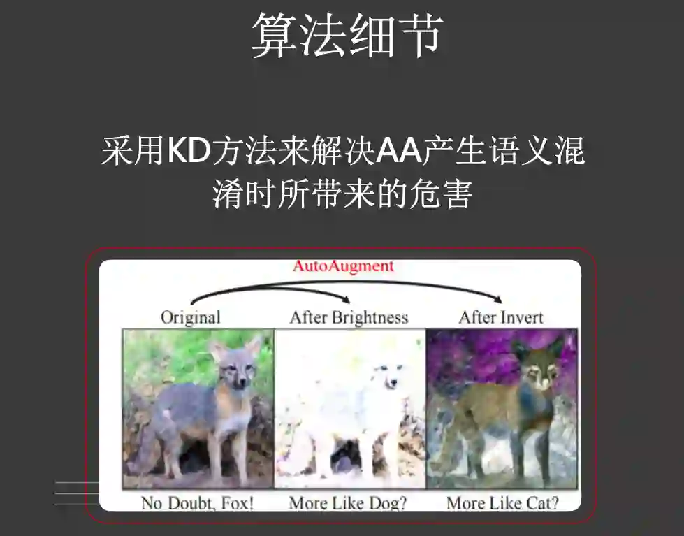 为了解决这个问题,华为提出了知识蒸馏的办法,通过预训练的模型,对AA的图片,产生软标签,再用软标签指导图形的训练。上图便是知识蒸馏后产生的软标签。