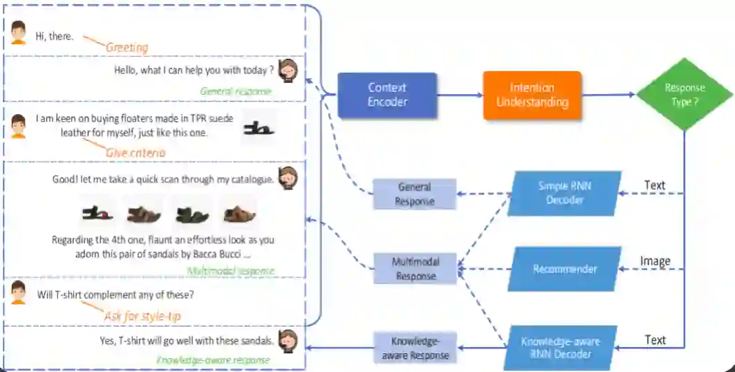针对这方面的工作,即如何对齐多模态数据,田奇重点介绍了他们在ACM MM 2019 上获得最佳论文提名的论文「Multimodal Dialog System: Generating Responses via Adaptive Decoders」。他们称之为“魔术模型”,论文本身是针对电子商务场景,用户在与机器克服对话过程中存在输入文本或图片的需求。他们针对这一问题,使用了一个统一的模型来编码不同模态的信息,从而能够根据上下文来反馈文字或图片。