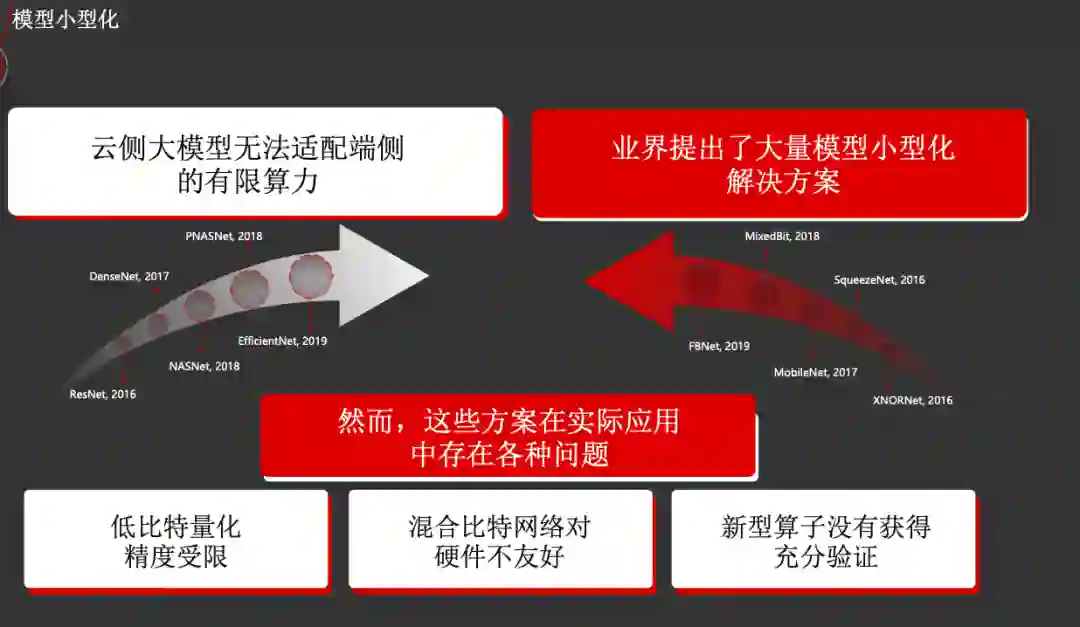 针对如何加速神经网络及模型小型化,田奇博士是这样思考的。目前大的网络模型发展如火如荼,但这样的模型更适合配置在云侧,而无法适配端侧。从2016年起,业界便开始探索模型加速和小型化的研究,也提出了大量小型化方案。但这些方案在实际中面临着诸多问题,包括:1)低比特量化使得精度受限;2)混合比特网络对硬件却并不友好;3)新型算子并没有得到充分的验证。